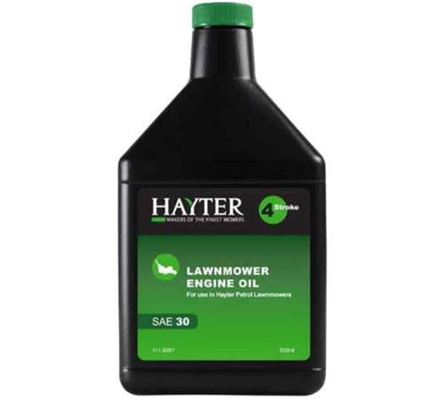 Use of Hayter SAE30 lawn mower oil minimises molecular shearing for extended life in hot air-cooled applications versus multi-grade oils (ie. 10W30)